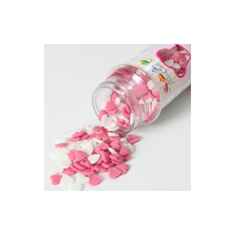 CUORICINI DI ZUCCHERO – rosa e bianchi: Ingredienti:zucchero, farina di riso, olio di arachidi idrogenato, fecola di patate, aroma, colorante (E120).