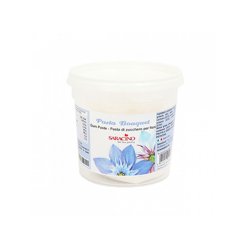 La ricetta che Saracino ha sperimentato con successo nel corso degli anni è caldamente raccomandata dai milgiori esecutori di questa tecnica decorativa. La realizzazione di fiori dai petali e dalle foglie sottili richiede una pasta particolarmente elastica e con veloci tempi di asciugatura. Senza glutine, senza grassi idrogenati, prodotto in Italia