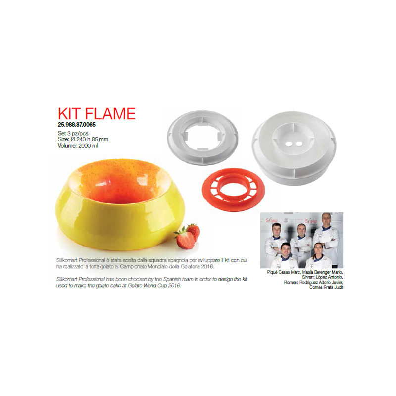Il Kit Flame è composto da 3 elementi: uno stampo in silicone per realizzare una preparazione dal volume di 2000 ml, un inserto in silicone per creare un dessert dall'inconfondibile effetto al taglio e un funzionale tagliapasta in plastica per la creazione di originali inserti e allo stesso tempo di basi d'appoggio in pan di spagna o croccante.